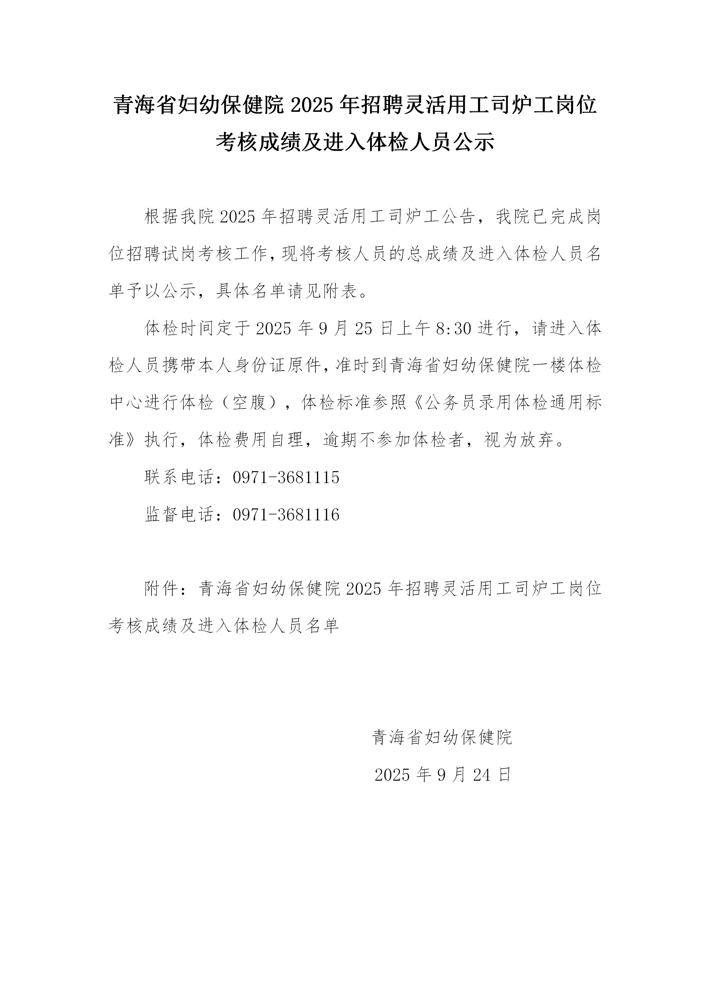 【公告】青海省妇幼保健院2025年招聘灵活用工司炉工岗位考核成绩及进入体检人员公示