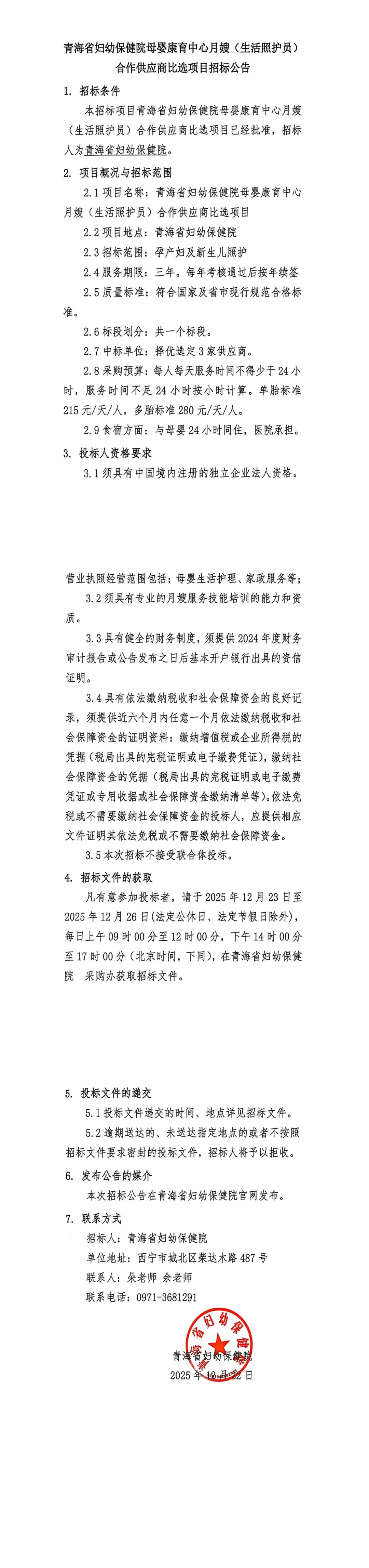 【公告】青海省妇幼保健院母婴康育中心月嫂(生活照护员)合作供应商比选项目招标公告