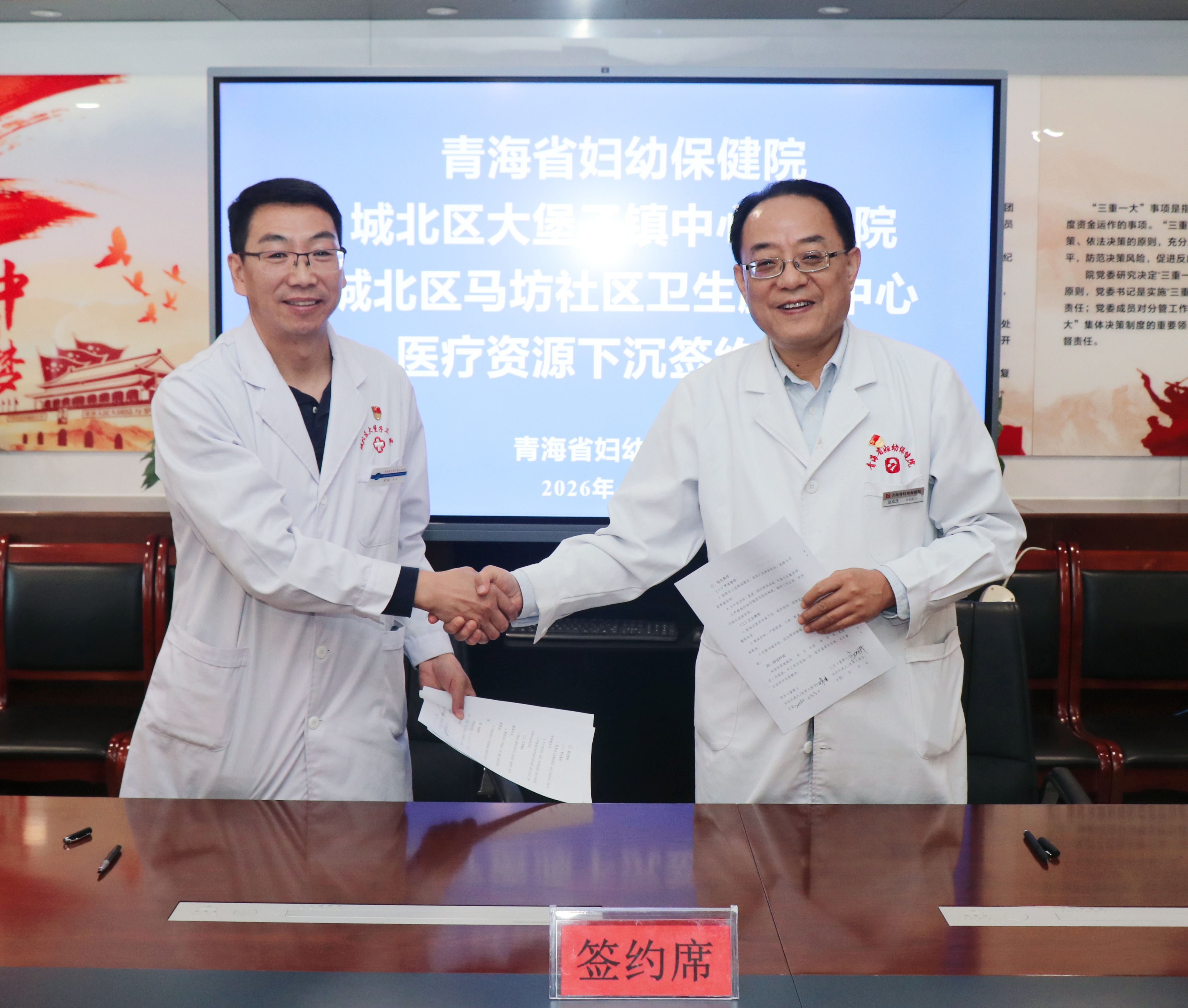 4月23日,青海省妇幼保健院与西宁市城北区大堡子镇中心卫生院、马坊社区卫生服务中心举行医疗资源下沉合作签约仪式,旨在推动优质妇幼医疗资源下沉基层,提升城北区基层医疗卫生机构妇幼健康服务能力,切实满足辖区群众就近享受优质妇幼医疗保健服务需求。