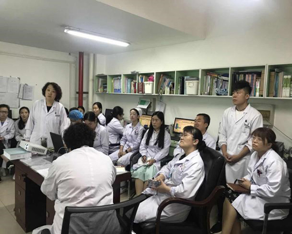 图为:沈阳妇婴医院宋丹阳主任在超声科开展午间培训