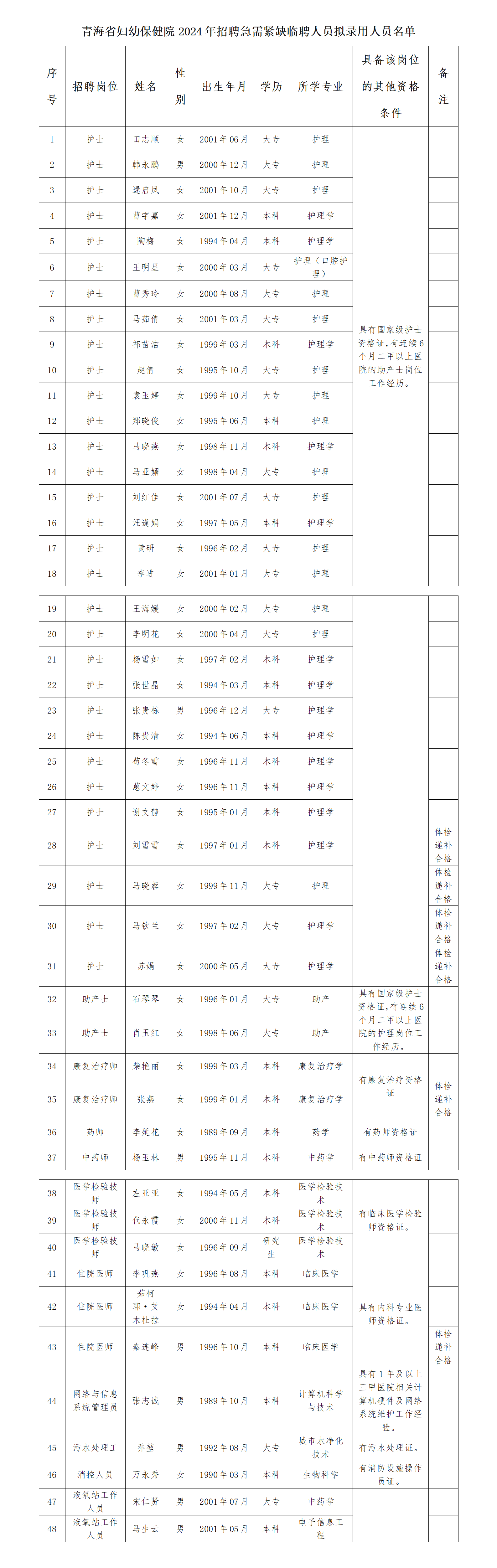 附表:青海省妇幼保健院2024年招聘急需紧缺临聘人员拟录用人员名单