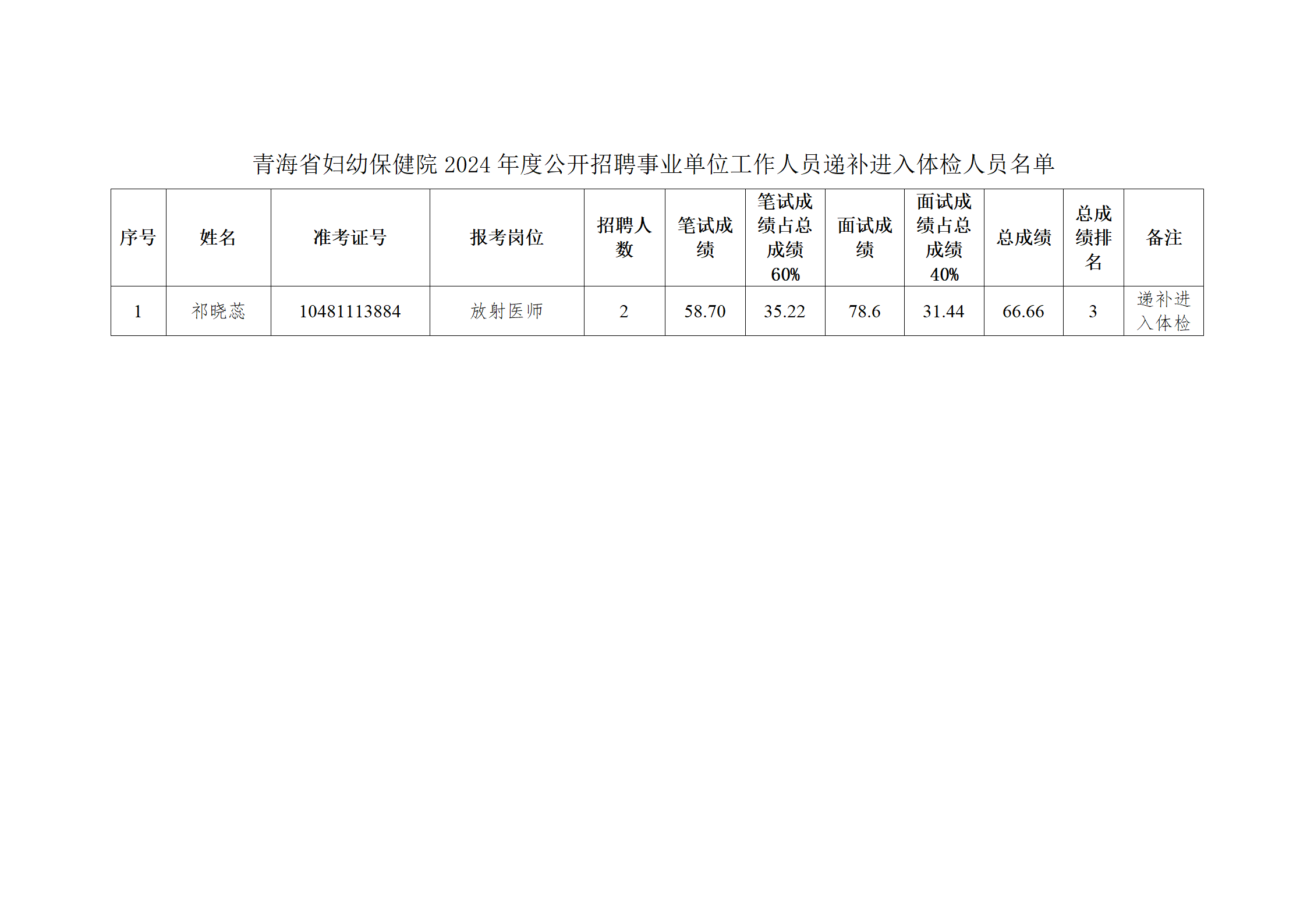 【公告】青海省妇幼保健院2024年公开招聘事业单位工作人员递补进入体检人员公示