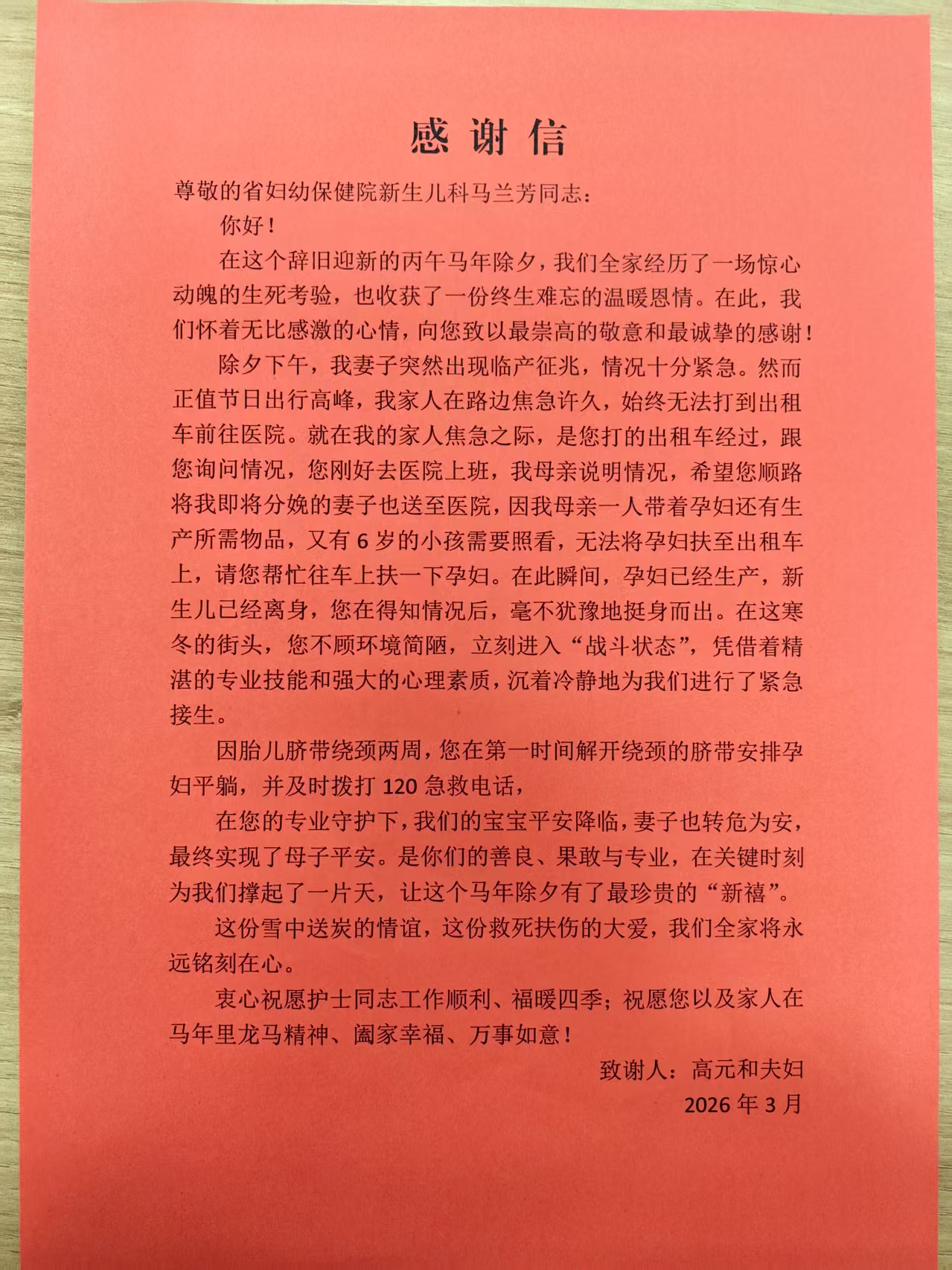 近日,一封感谢信被郑重送至青海省妇幼保健院,字里行间的感激热烈滚烫。致谢人高元和夫妇用质朴的文字,还原了马年除夕那场惊心动魄的生死救援,也让马兰芳护士的暖心善举,被更多人看见。