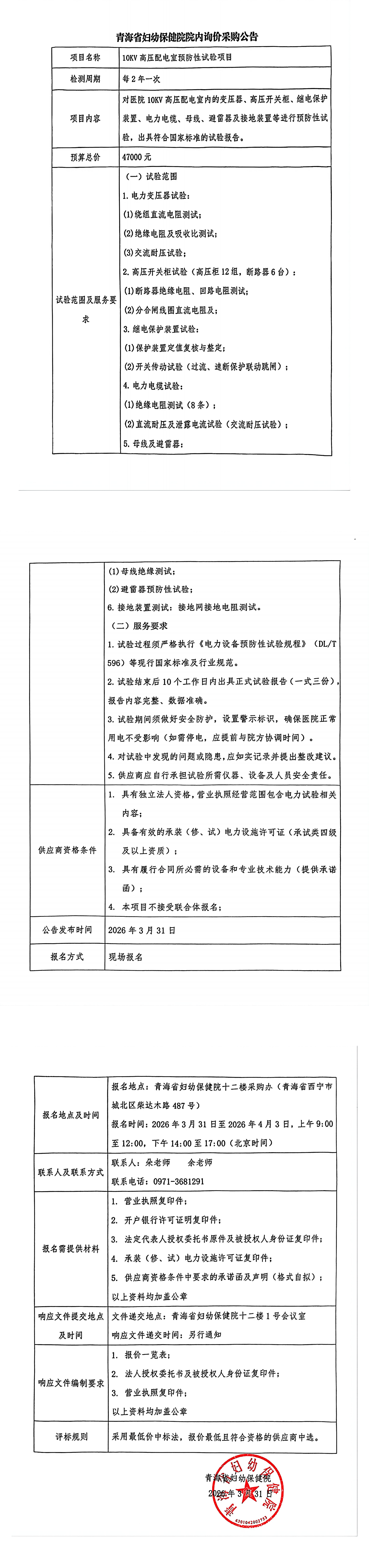 【公告】青海省妇幼保健院院内询价采购公告