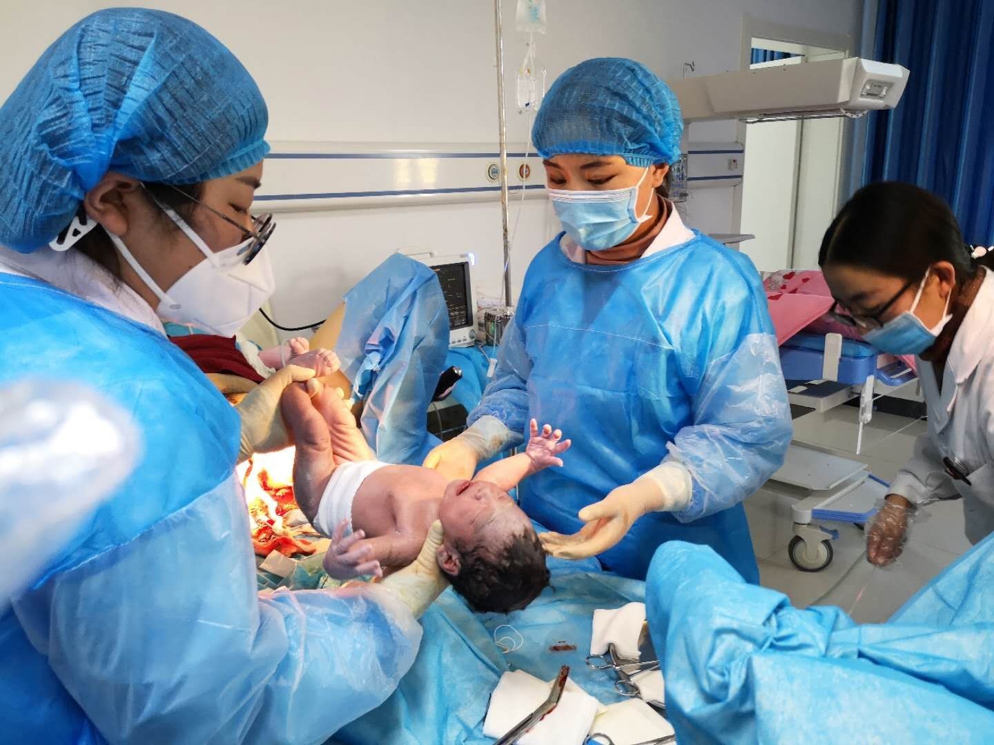 孩子出生后,李海虹主管护师立即带领久治县医院产科医护人员现场实施了出生后皮肤早接触、早吸吮、延迟脐带结扎等内容的新生儿安全项目适宜技术。