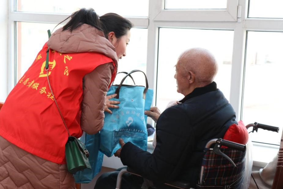 志愿者们为老人们送去了生活用品和美好祝愿,并进入失智失能老人的房间,耐心的与他们交流谈心,为他们带去了开心和欢乐。