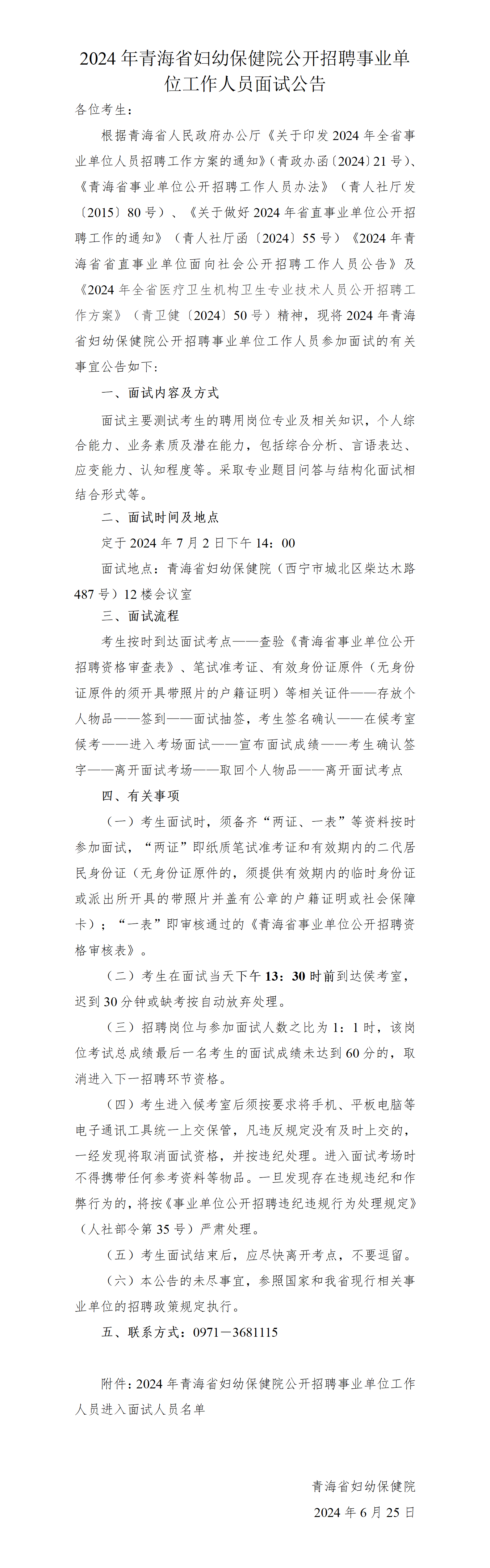 【公告】2024年青海省妇幼保健院公开招聘事业单位工作人员面试公告