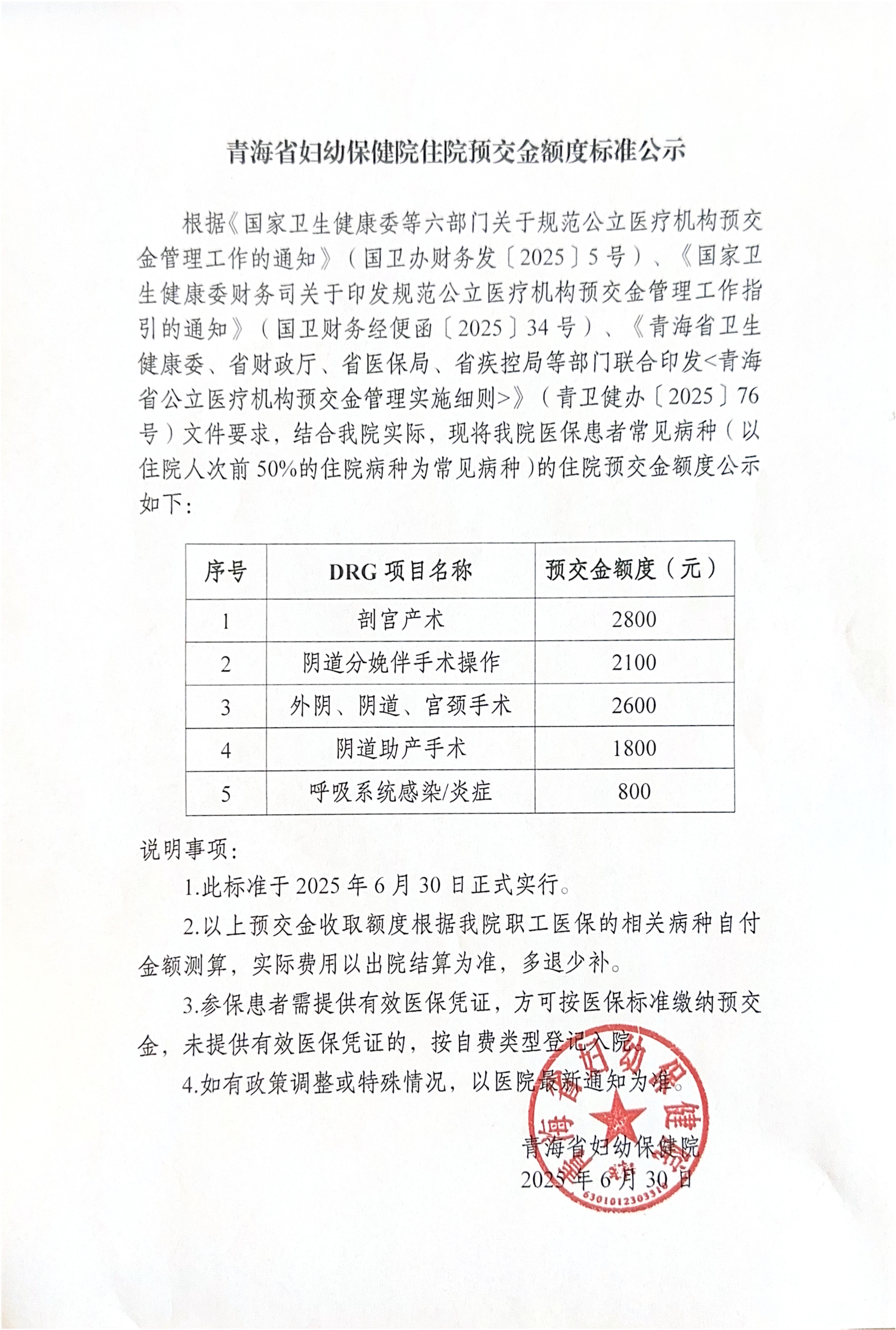 【公示】青海省妇幼保健院住院预交金额度标准公示