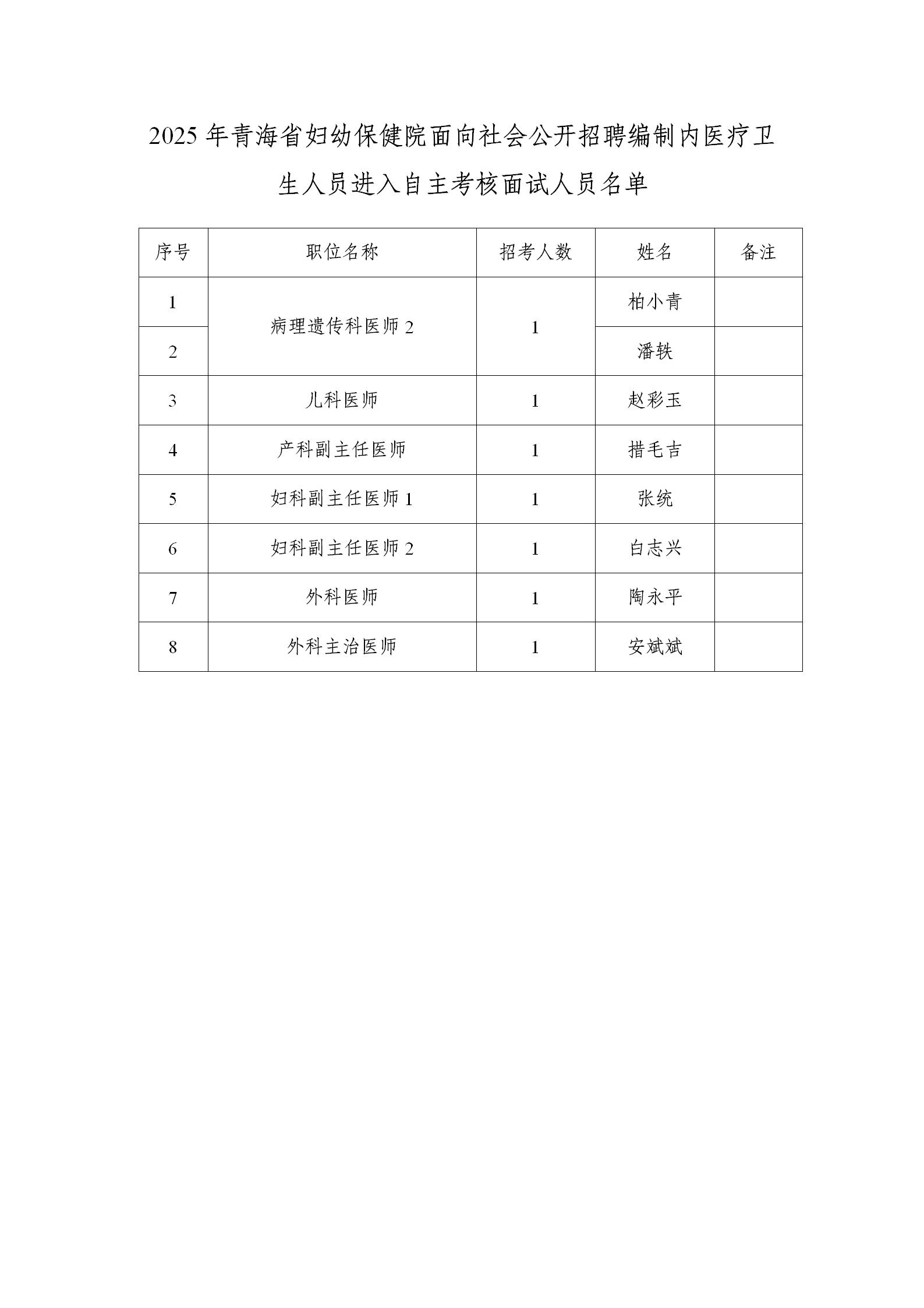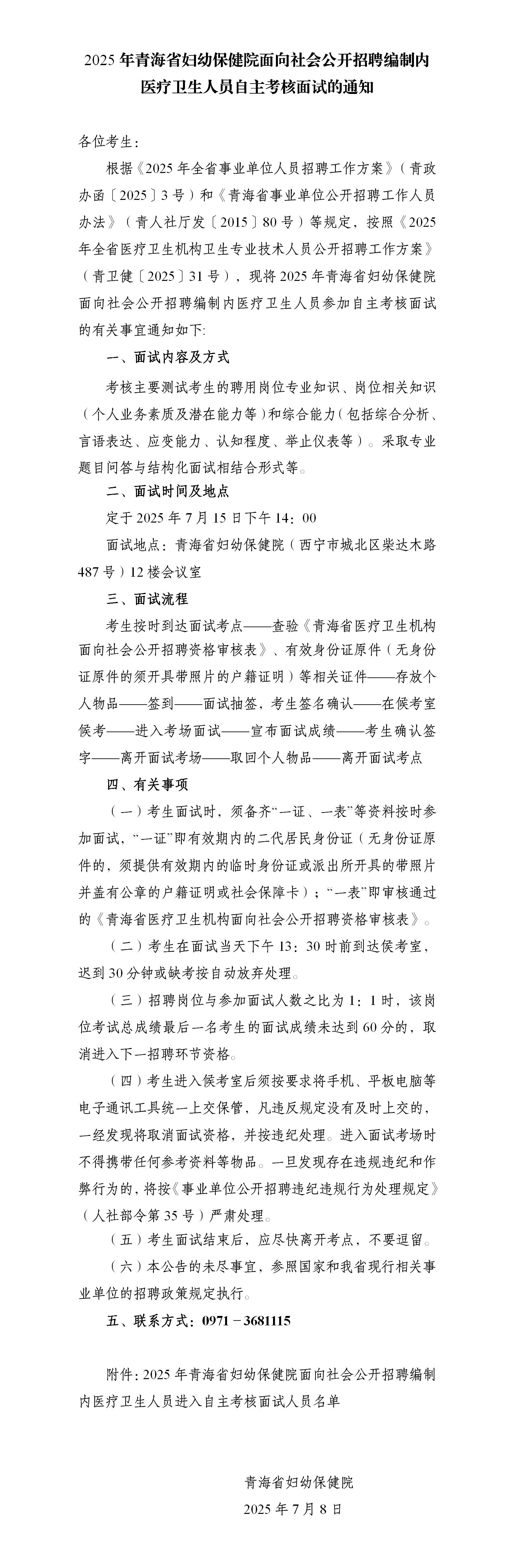 【公告】2025年青海省妇幼保健院面向社会公开招聘编制内医疗卫生人员自主考核面试的通知
