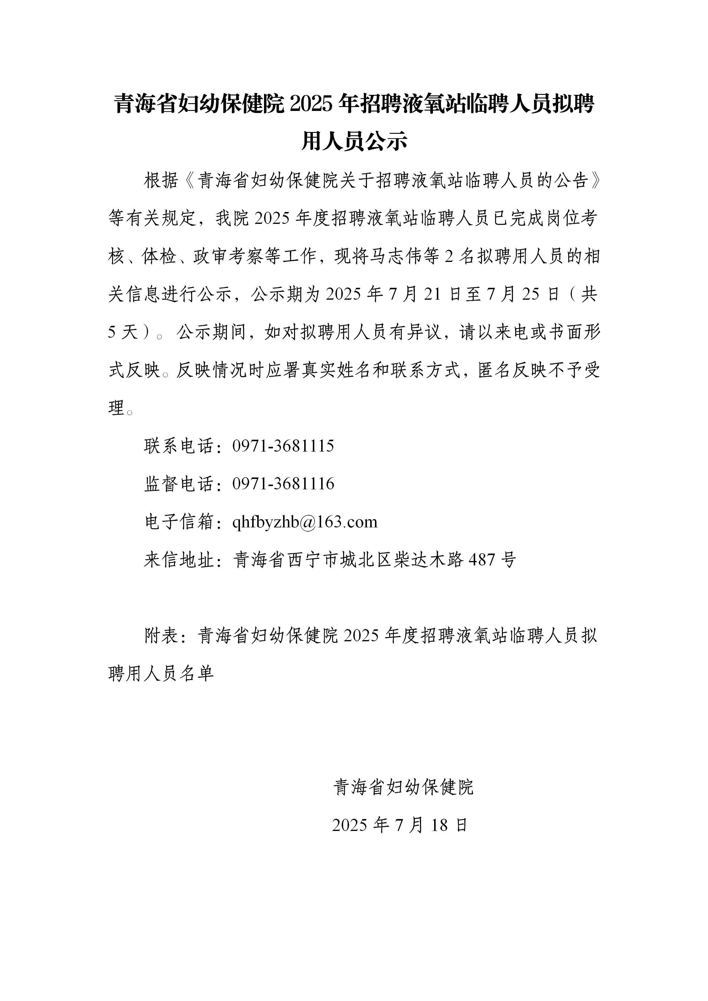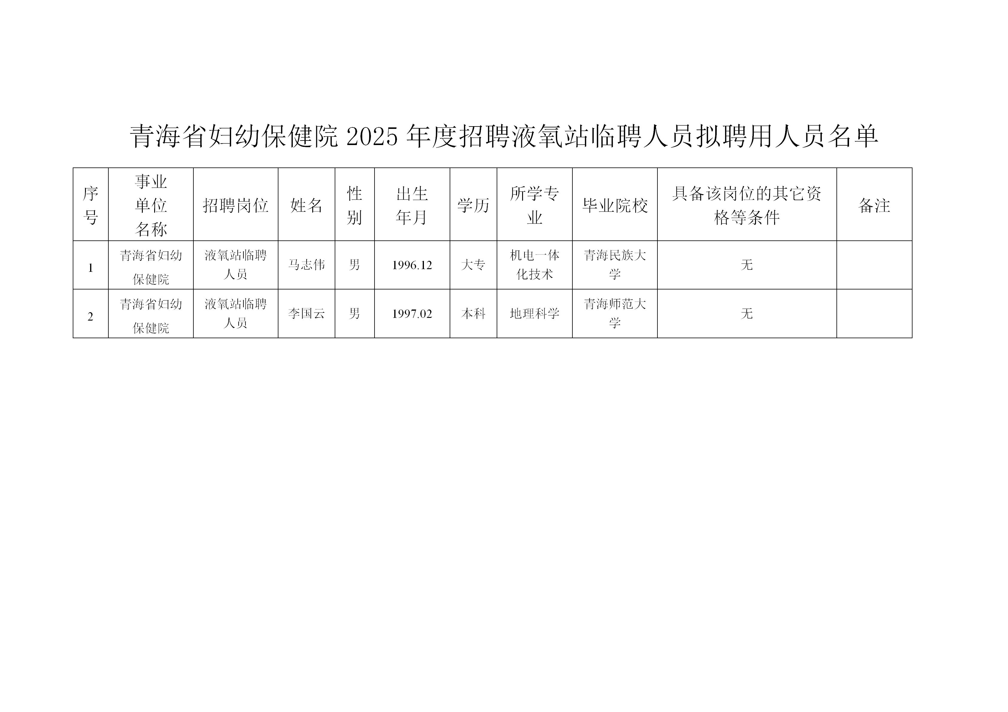 【公告】青海省妇幼保健院2025年招聘液氧站临聘人员拟聘用人员公示