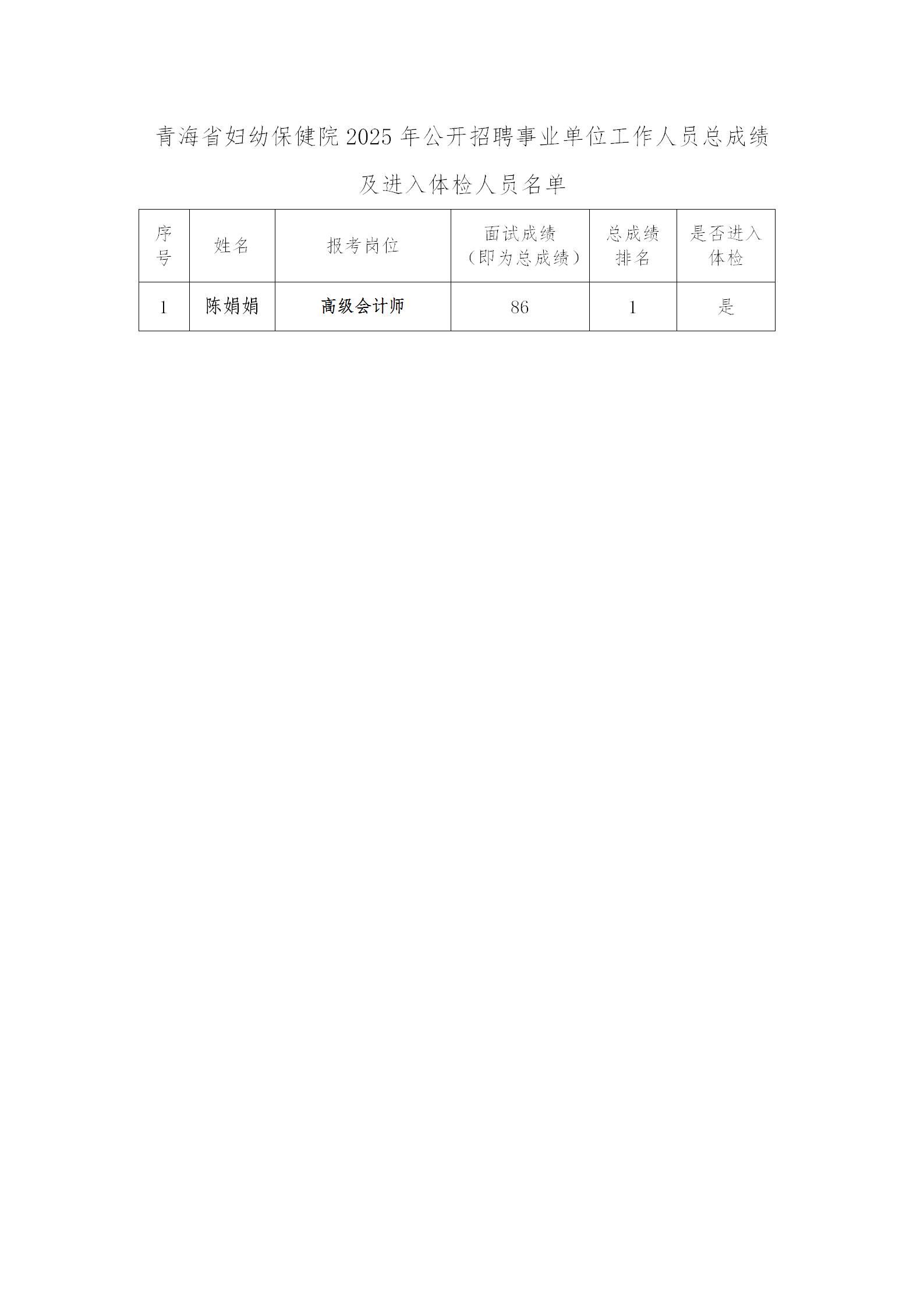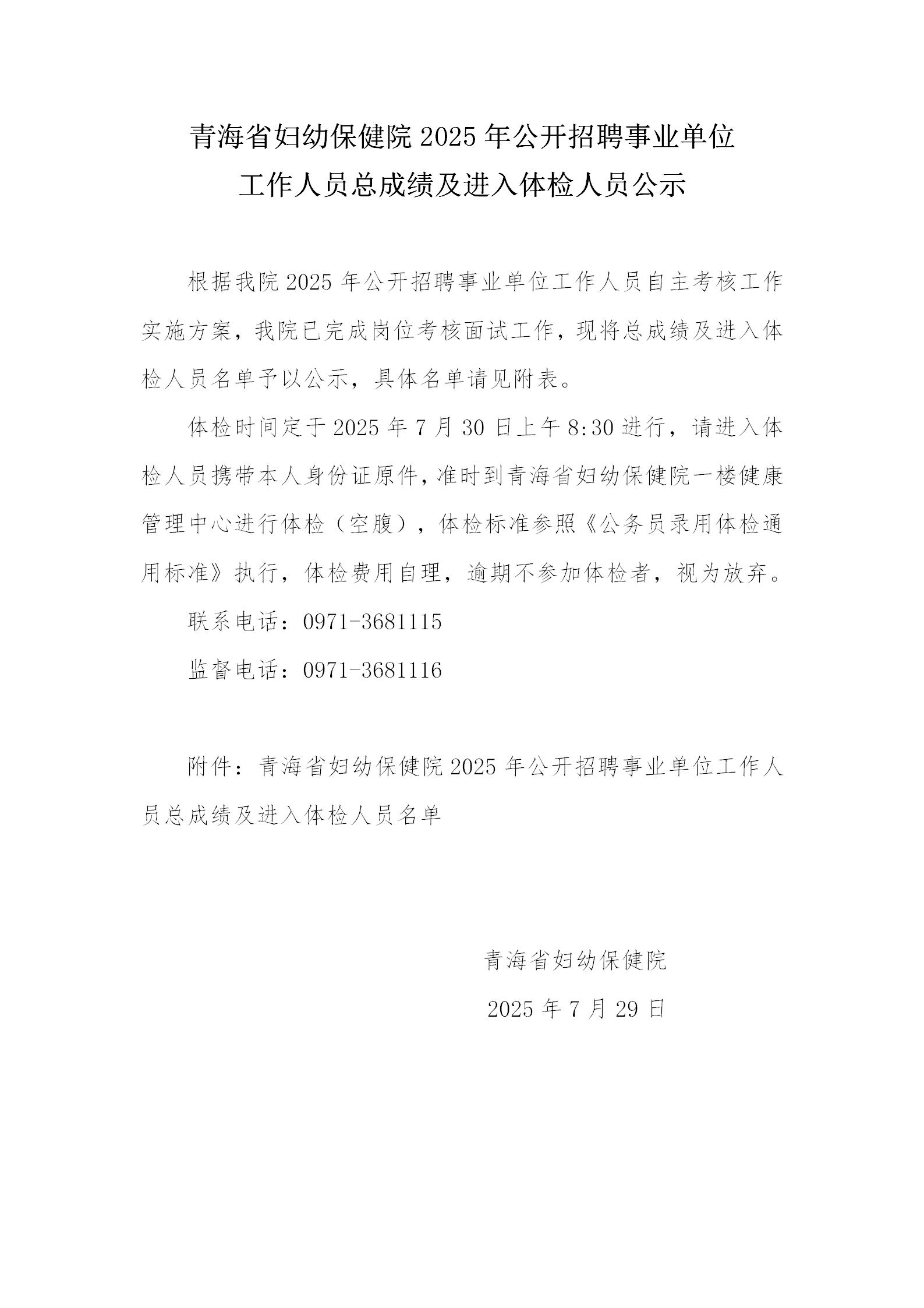 【公告】青海省妇幼保健院2025年公开招聘事业单位工作人员总成绩及进入体检人员公示