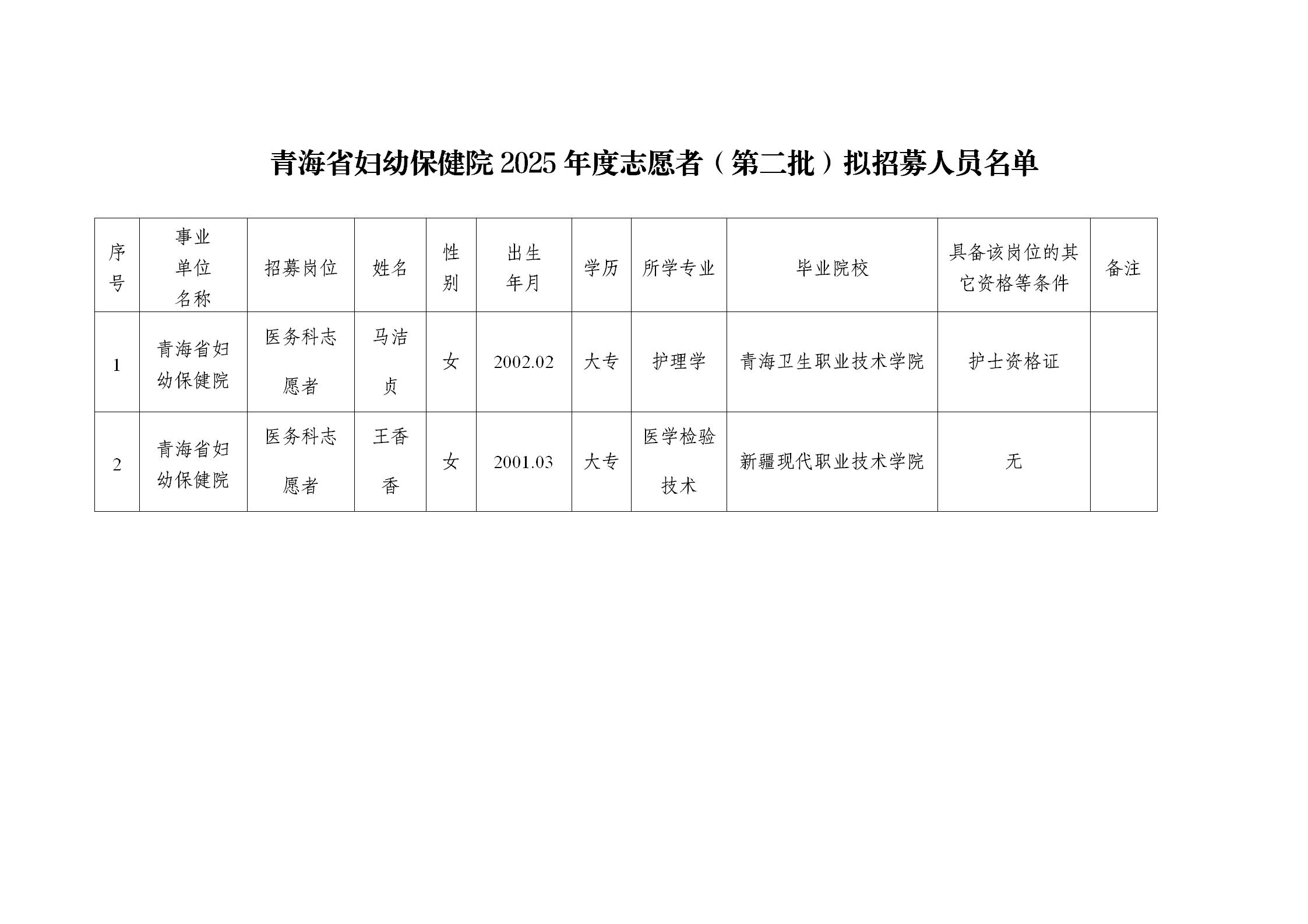 【公告】青海省妇幼保健院2025年志愿者拟招募人员(第二批)公示
